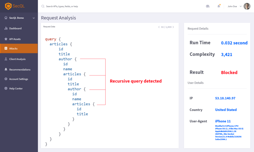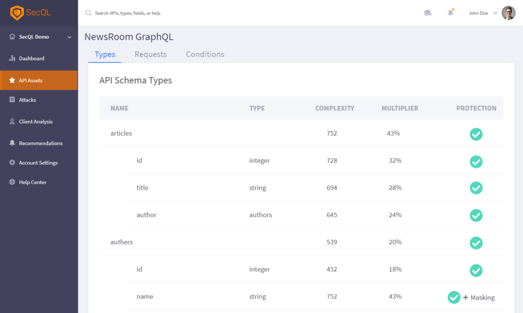 The SecQL Security Platform secures the GraphQL APIs that connect your SaaS, web, and mobile applications using advanced analytics and data analysis to gain visibility into requests complexity and limit volumetric attacks as well as stop vulnerability attacks.